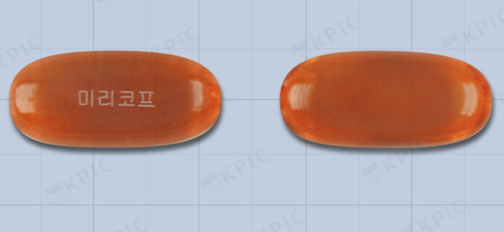 미리코프연질캡슐은 외형적으로 무색 내지 오렌지색의 투명한 내용물을 함유한 오렌지색의 투명한 장방형 연질캡슐로 되어있는 의약품입니다.
