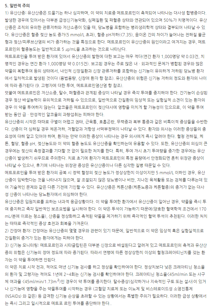 1) 중등도(stage 3b) 및 중증의 신장애 환자(크레아티닌 청소율 < 45 mL/min 또는 사구체 여과율 < 45 mL/min/1.73 m2), 탈수, 심각한 감염, 심혈관계 허탈(쇽), 급성 심근경색, 패혈증과 같은 신기능에 영향을 줄 수 있는 급성 상태