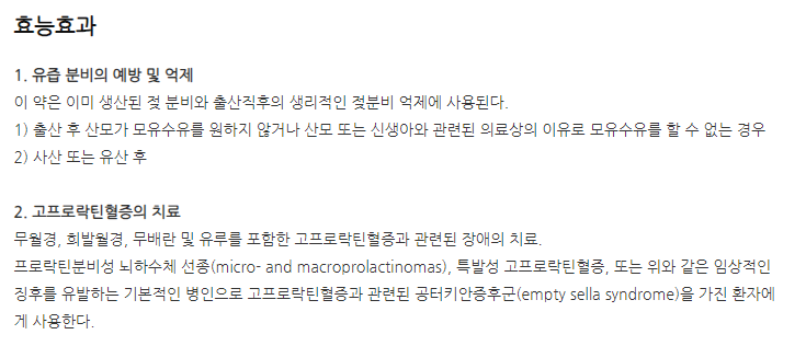 약의 성분은 카베르골린 0.25mg 포함되어 있다고 하니 참고하세요.