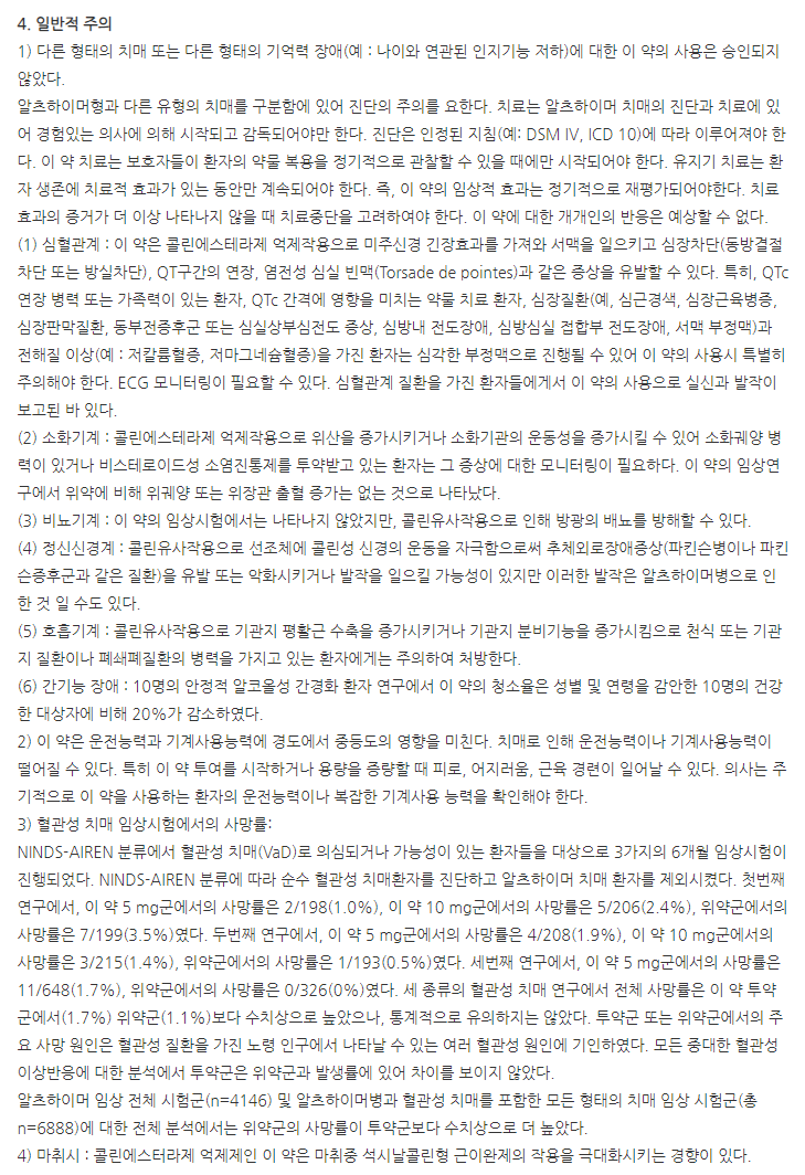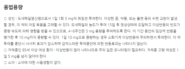 약의 성분은 도네페질염산염수화물 5.215mg 포함되어 있다고 하니 참고하세요.