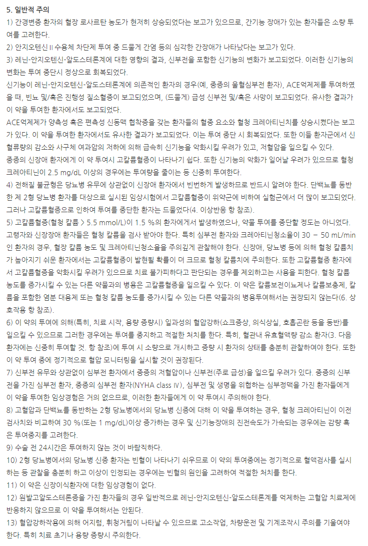 7) 당뇨병이나 중등도~중증의 신장애 환자(사구체여과율 <60mL/min/1.73m2)에서 알리스키렌 함유제제와의 병용